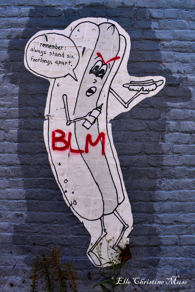 Along with quiet window shopping and people milling about, there were some surprising little gems to bring a smile to one’s face. Decorative art pieces and light graffiti featuring COVID masks and Black Lives Matter protests subtlety decorate hidden alcoves off the main drag.