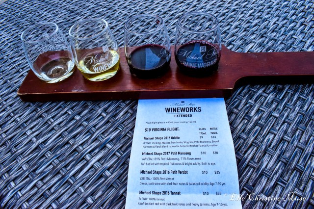 My chosen flight consisted of four different Virginian wines, two reds and two whites, all created by wine-maker Michael Shaps. They are listed as follows: